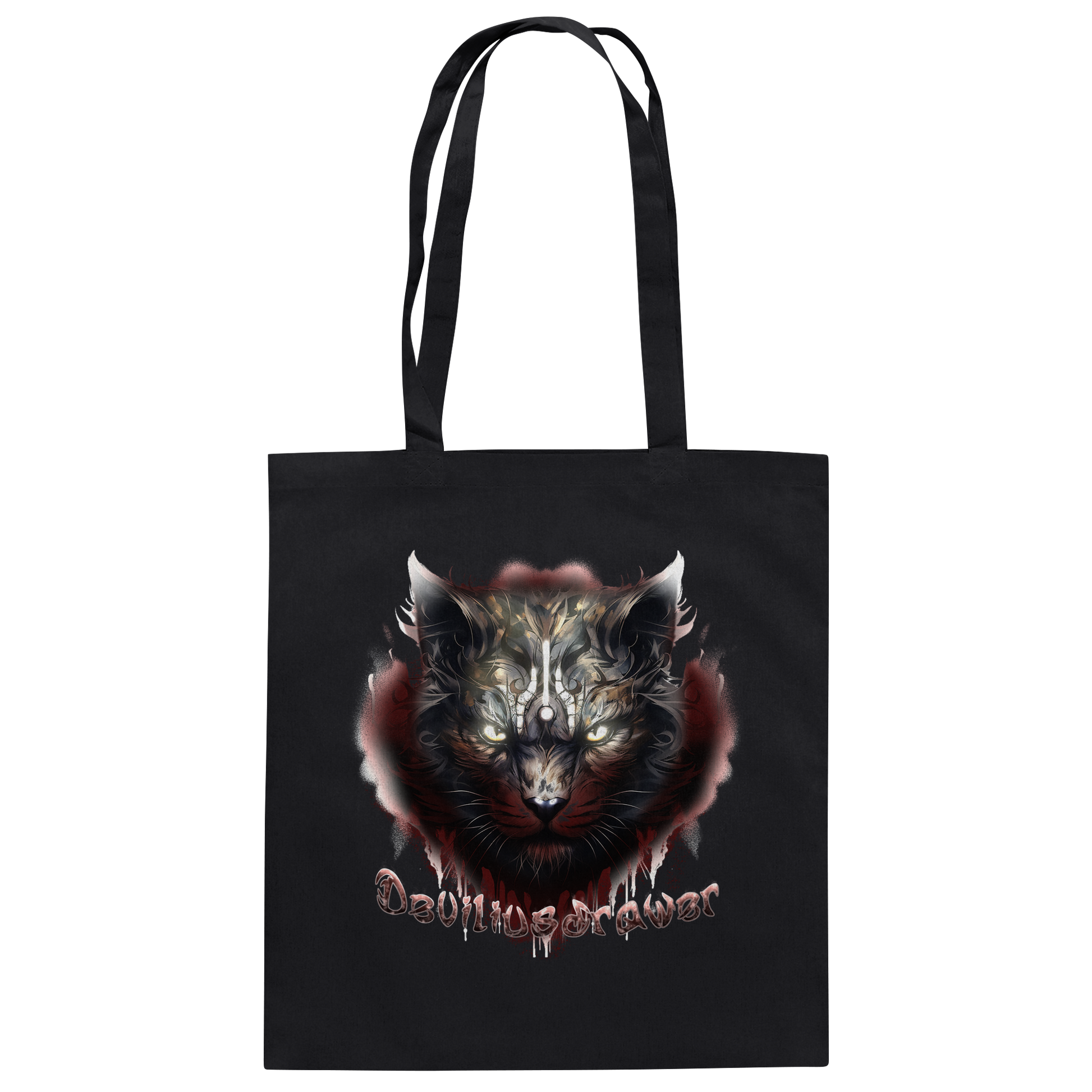 Die Tasche zeigt ein eindrucksvolles Katzenmotiv mit intensiven, leuchtenden Augen. Der kunstvolle Einsatz von Linien und Schattierungen verleiht dem Design eine mystische Tiefe.