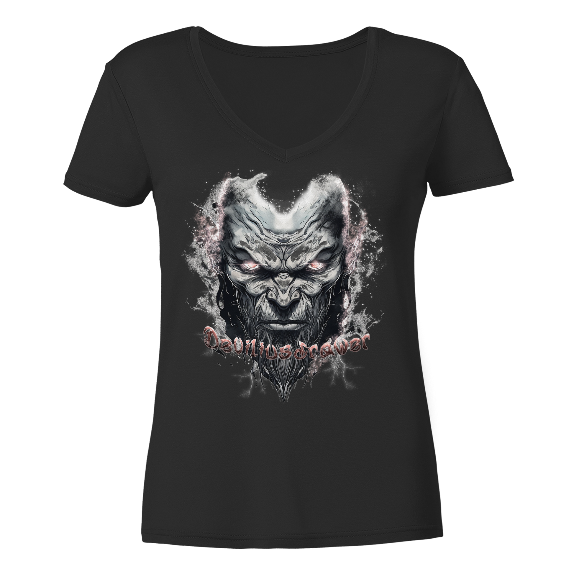 Erlebe den perfekten Mix aus Stil und Komfort mit dem Deviliusdrawer Bad Boy - Ladies V-Neck Shirt. Die fesselnde Illustration eines mystischen Gesichts, umgeben von geheimnisvollen Mustern, zieht sofort alle Blicke auf sich. Die dominierende Schwarz-Weiß-Palette, durchzogen von zarten Rosaakzenten, verleiht dem Design eine kraftvolle und zugleich feminine Note.