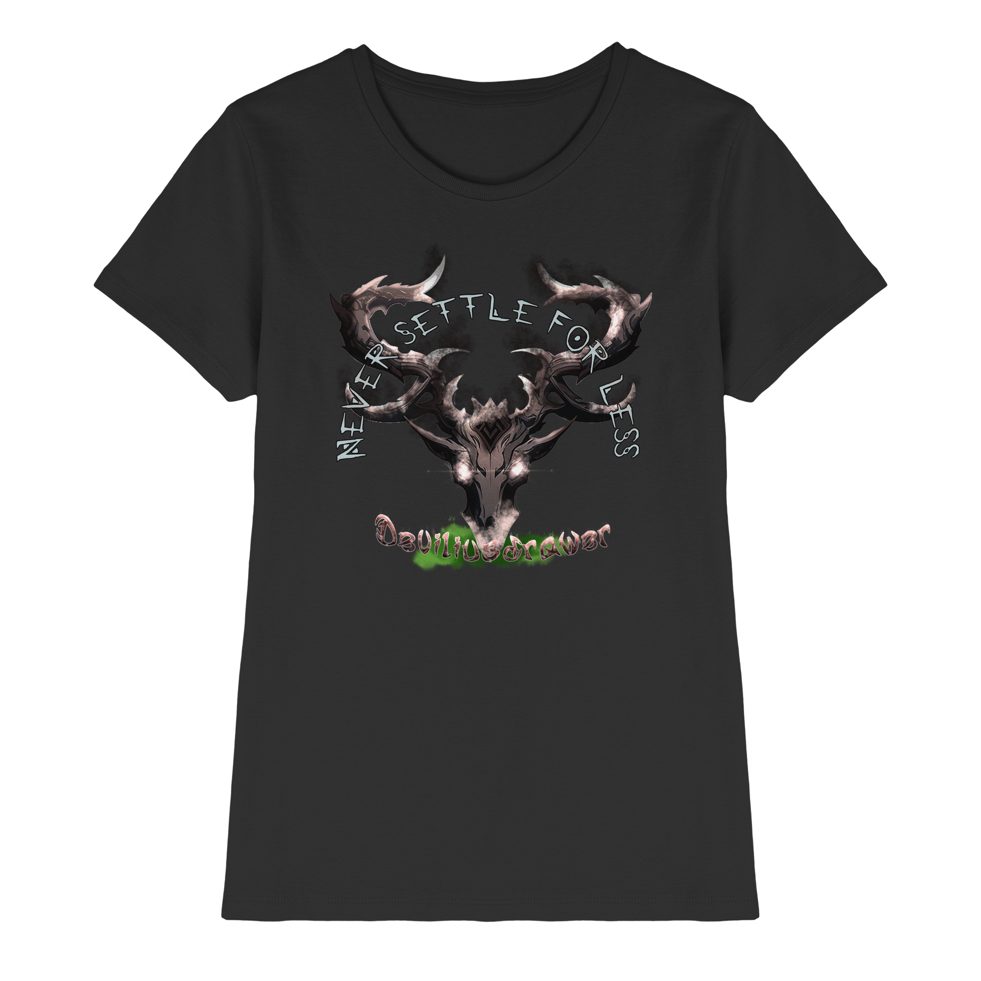 Entdecken Sie das "Deviliusdrawer Cruel Deer" Damen Premium Shirt, eine limitierte Auflage voller Kreativität und Ausdruckskraft. Dieses Shirt zeigt ein fesselndes Design eines majestätischen Hirschkopfes mit dunklen, geschwungenen Hörnern, umgeben von dem inspirierenden Motto "Never Settle for Less". Die harmonische Farbgebung aus tiefen Brauntönen und Akzenten in Grün und Rosa verleiht dem Shirt eine mystische und zugleich kraftvolle Ausstrahlung.