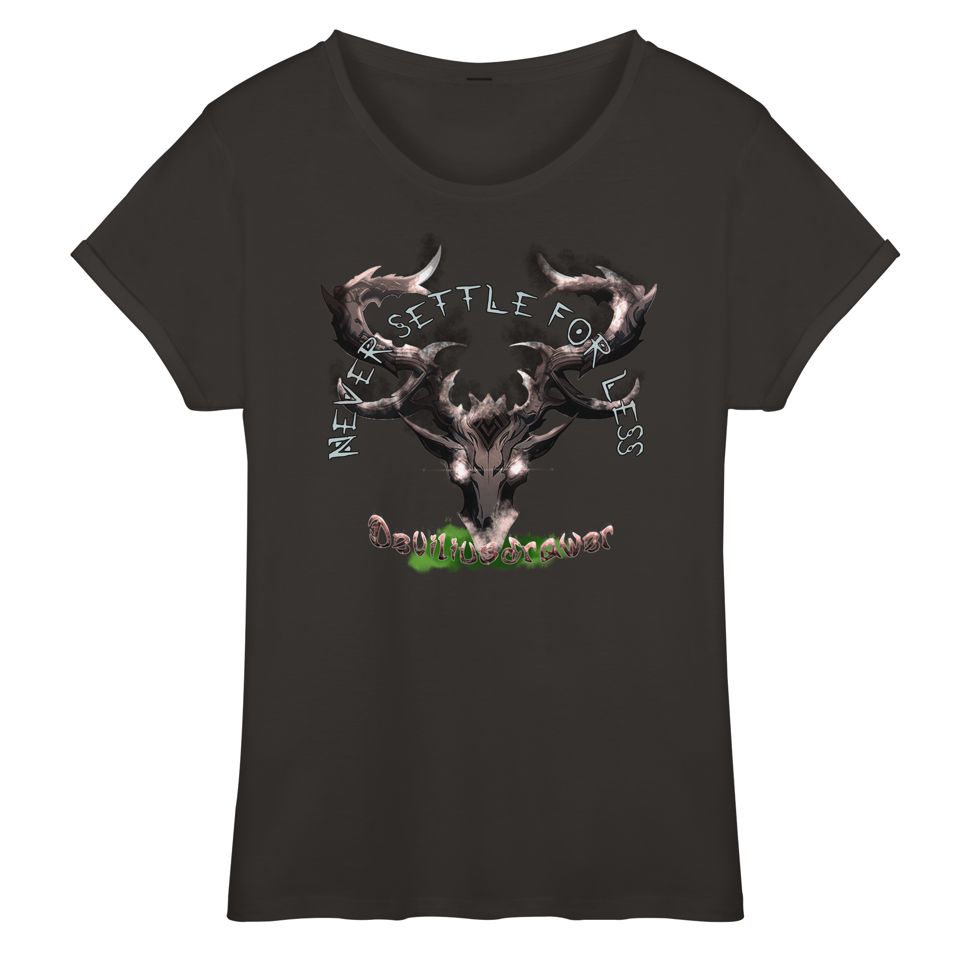 Lass dich von der kraftvollen Symbolik der Deviliusdrawer Cruel Deer Damen Roll-Up T-Shirt Kollektion inspirieren. Der majestätische Hirschkopf, umrahmt von kunstvollen Hörnern, strahlt Stärke und Entschlossenheit aus. Die Worte „NEVER SETTLE FOR LESS“ verkörpern deine innere Stärke und den Antrieb, immer das Beste zu erreichen.