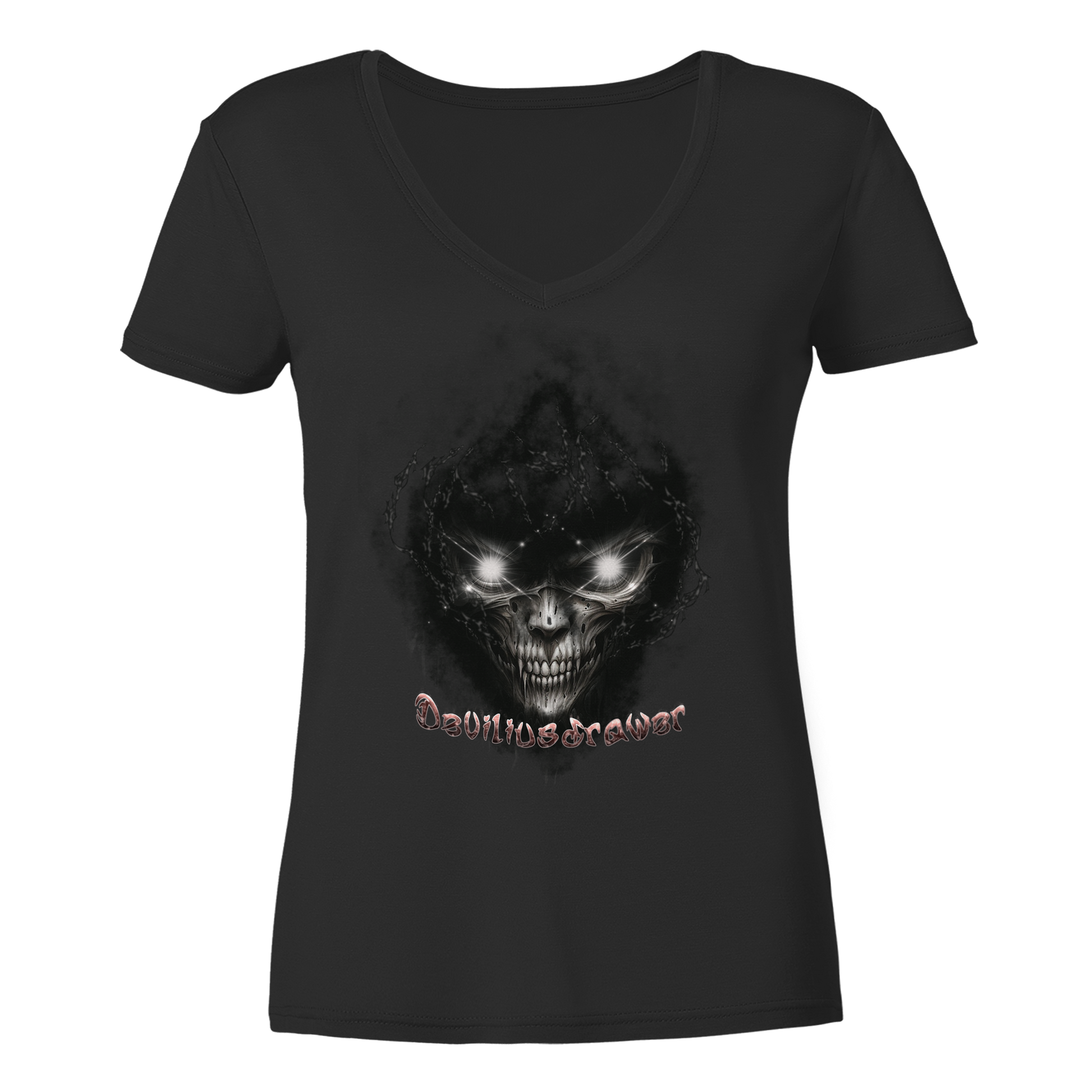 Tauche ein in die mystische Dunkelheit mit dem "Deviliusdrawer Dark Death - Ladies V-Neck Shirt". Dieses einzigartige Design vereint düstere Ästhetik mit stilvoller Eleganz. Der eindrucksvolle Totenkopf, eingebettet in ein Netz aus Schatten, lässt die Augen leuchten und zieht alle Blicke magisch an.