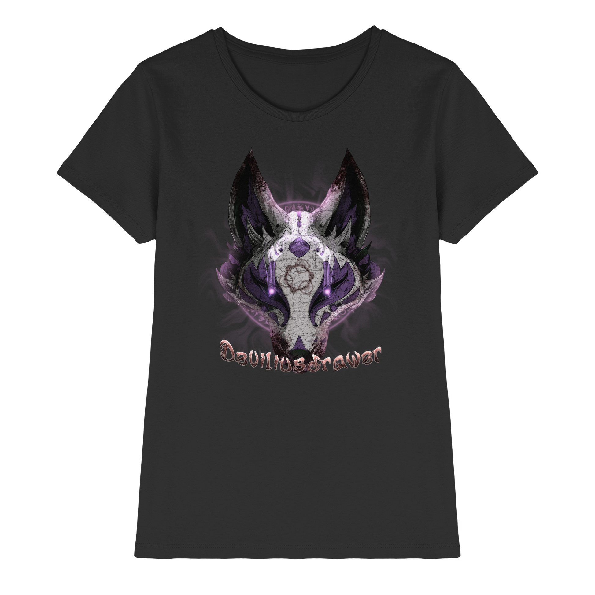 Erlebe ein einzigartiges Design mit dem Deviliusdrawer Dark Kitsune Shirt. Die mystische Kitsune-Maske, umgeben von lila Flammen, zieht alle Blicke auf sich. Die Kombination aus tiefem Schwarz und lebendigem Lila verleiht dem Design eine geheimnisvolle Aura.