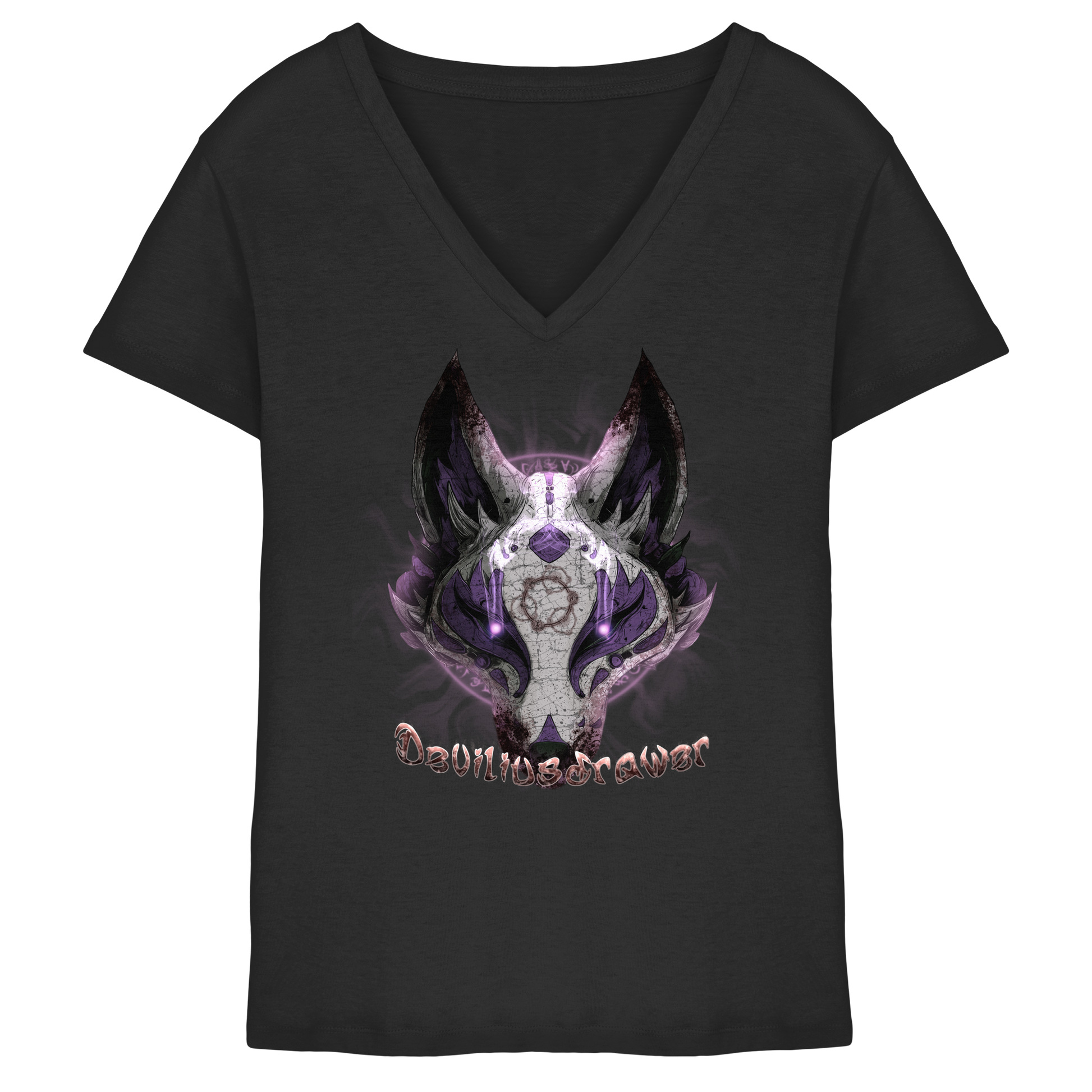 Erwecken Sie Ihre innere Göttin mit dem Deviliusdrawer Dark Kitsune Damen V-Ausschnitt Shirt. Dieses einzigartige Design verschmilzt mystische Kitsune-Symbolik mit moderner Eleganz.