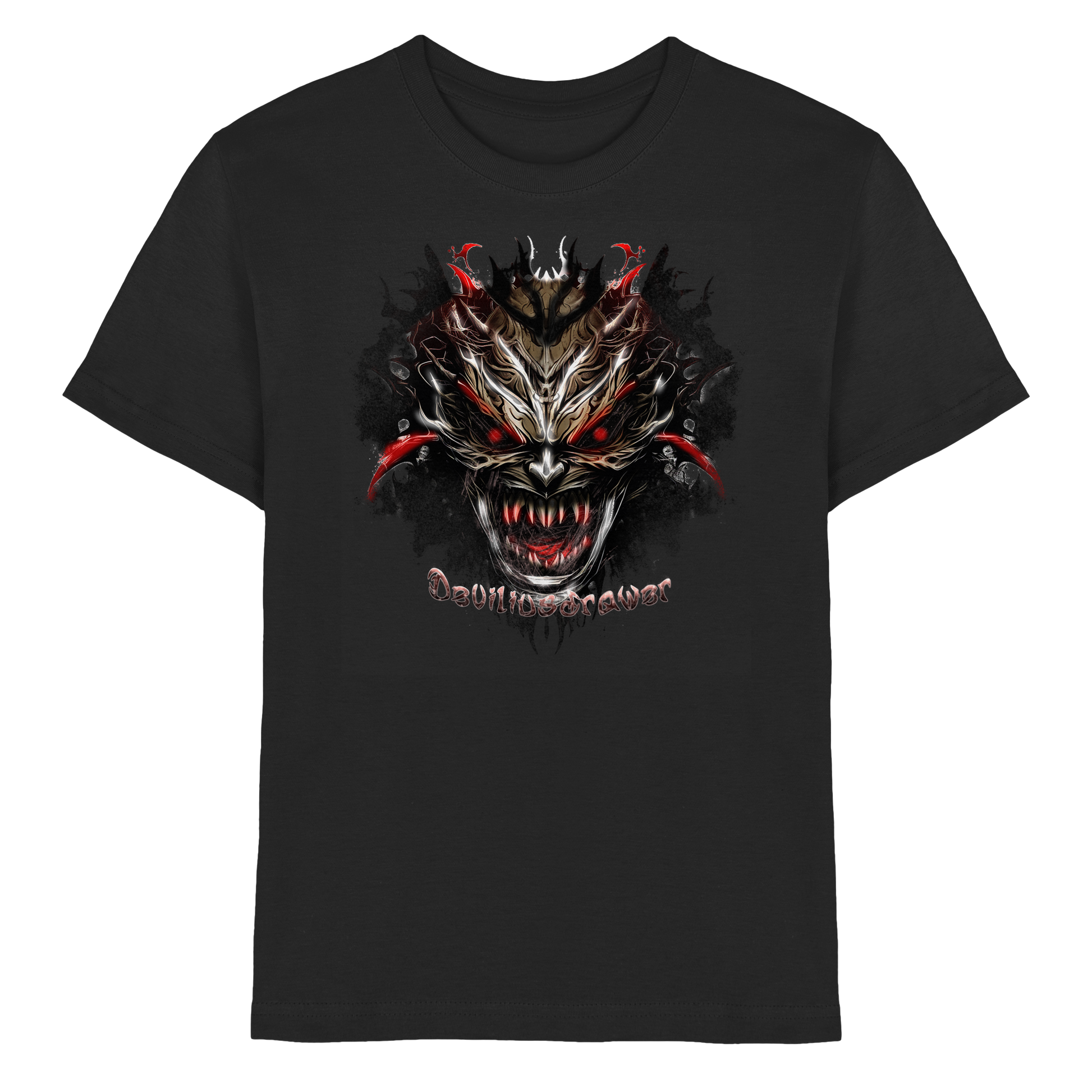 Die dominierenden schwarzen und roten Farben verstärken den mystischen Effekt, während die feinen Linien und Schattierungen dem Teufelsgesicht Tiefe verleihen. Der Schriftzug rundet das Design ab und verleiht dem Shirt eine rebellische Note.