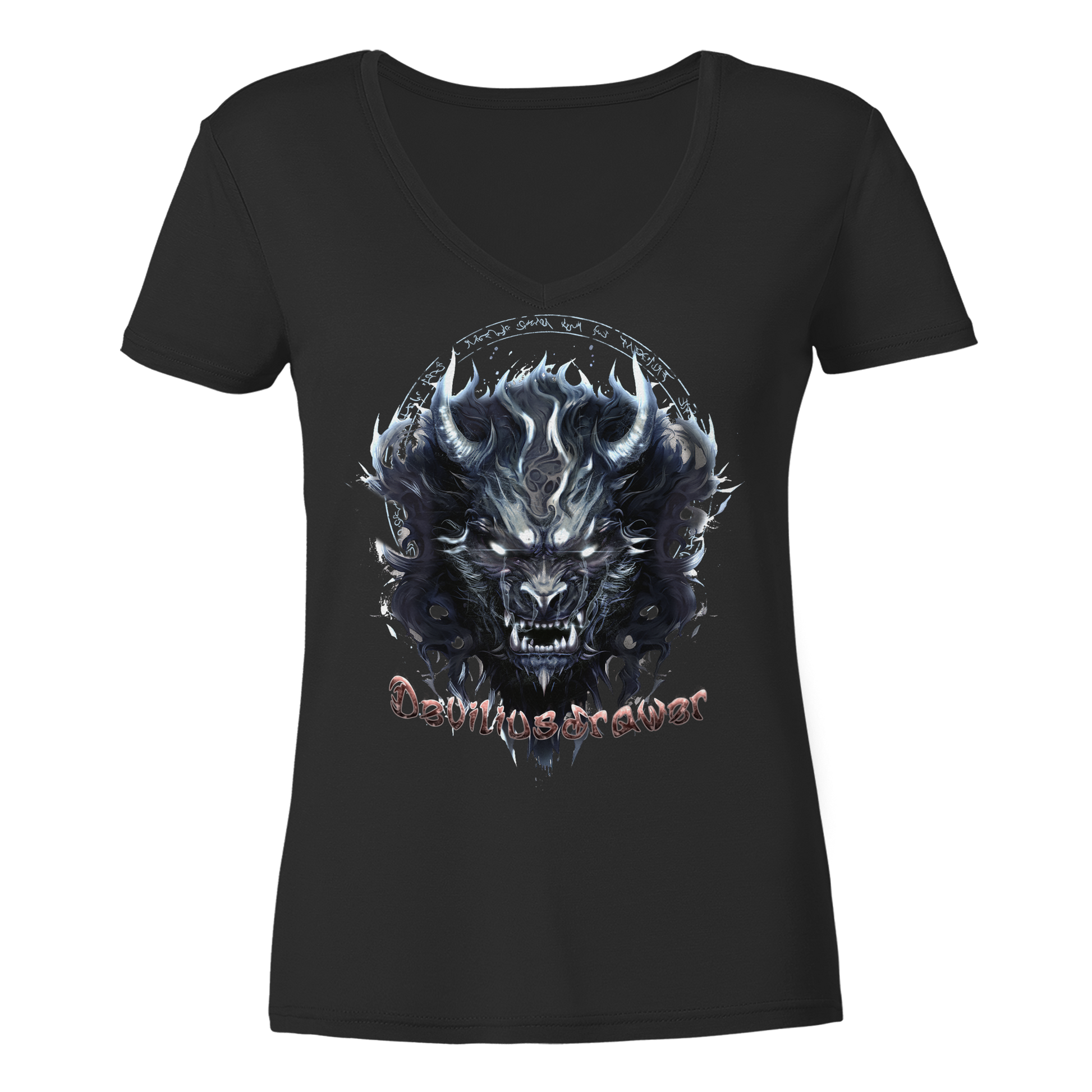 Dieses limitierte Damen V-Neck Shirt von Deviliusdrawer bringt die Kraft des dunklen Wolfes direkt in Ihre Garderobe. Der eindrucksvolle Wolfsmasken-Print, umgeben von mystischen Mustern, zieht alle Blicke auf sich und verleiht Ihnen eine Aura von Stärke und Geheimnis.