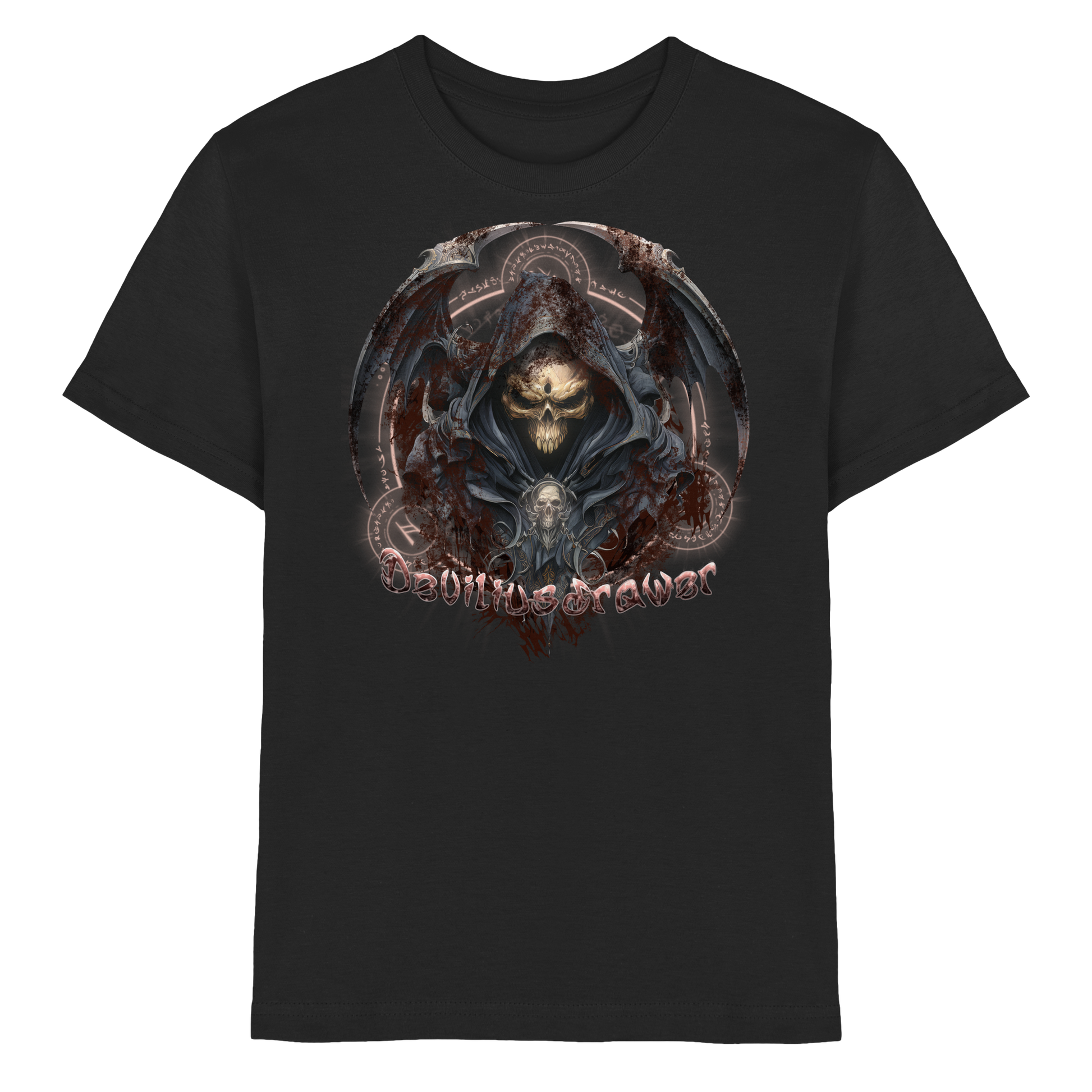 Der Deviliusdrawer Death Reaper - ein T-Shirt, das Geschichten von Tapferkeit und Geheimnissen erzählt. Mit einem furchteinflößenden Sensenmann-Design, umgeben von mystischen Schwingen und düsteren Farben, spricht es direkt die Fantasie der Kleinen an.