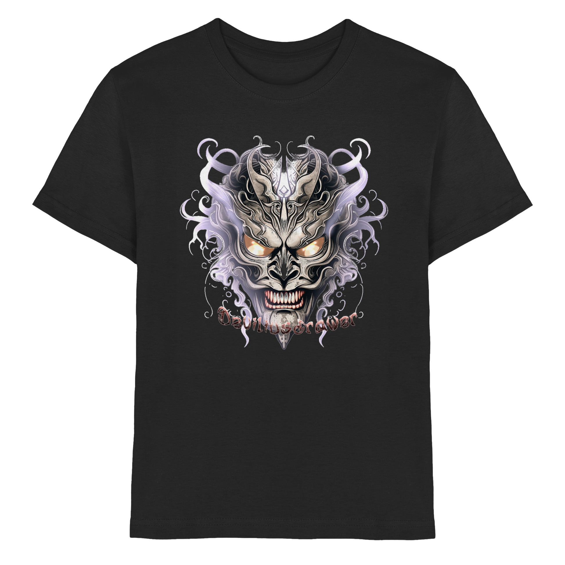 Die kunstvoll gestaltete Dämonenmaske ist das Herzstück dieses Shirts. Mit detaillierten Linien und einem kraftvollen Ausdruck symbolisiert sie Stärke und Mystik.