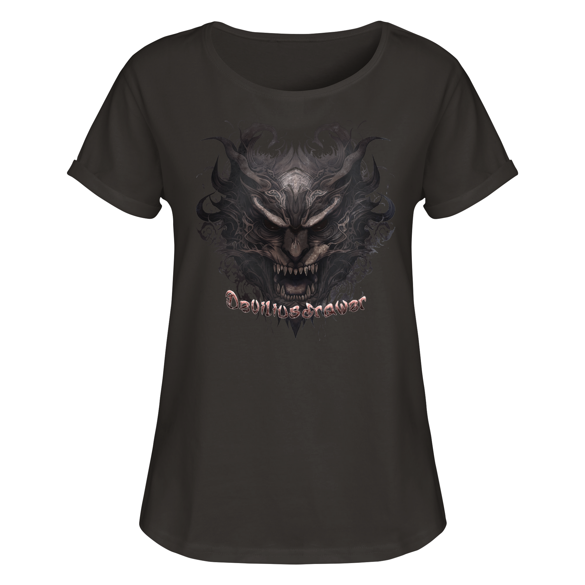 Erleben Sie die dunkle Eleganz mit unserem Deviliusdrawer Demon Damen Roll-Up T-Shirt. Dieses limitierte Design verkörpert die mystische Kraft und den rebellischen Geist. Der eindrucksvolle Dämonenkopf, umrahmt von filigranen Linien, zieht alle Blicke auf sich.