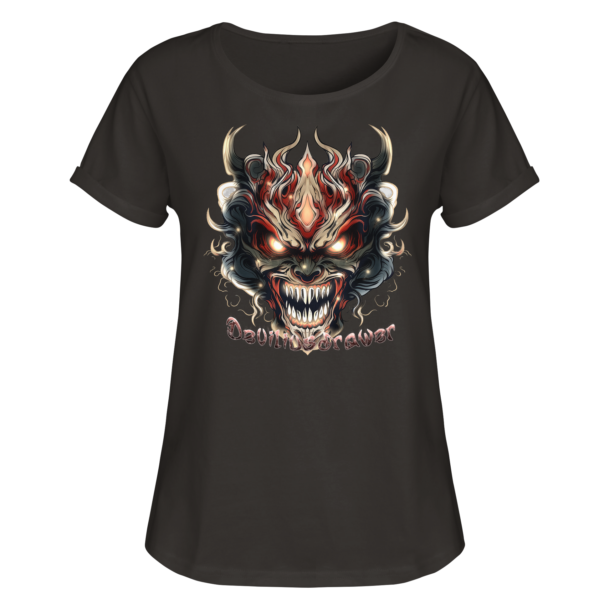Erlebe den Nervenkitzel des Unbekannten mit unserem Deviliusdrawer Evil Vamp Mask - Womens Roll-Up T-Shirt. Dieses einzigartige Design zieht alle Blicke auf sich und verbindet mystische Motive mit lebendigen Farben.