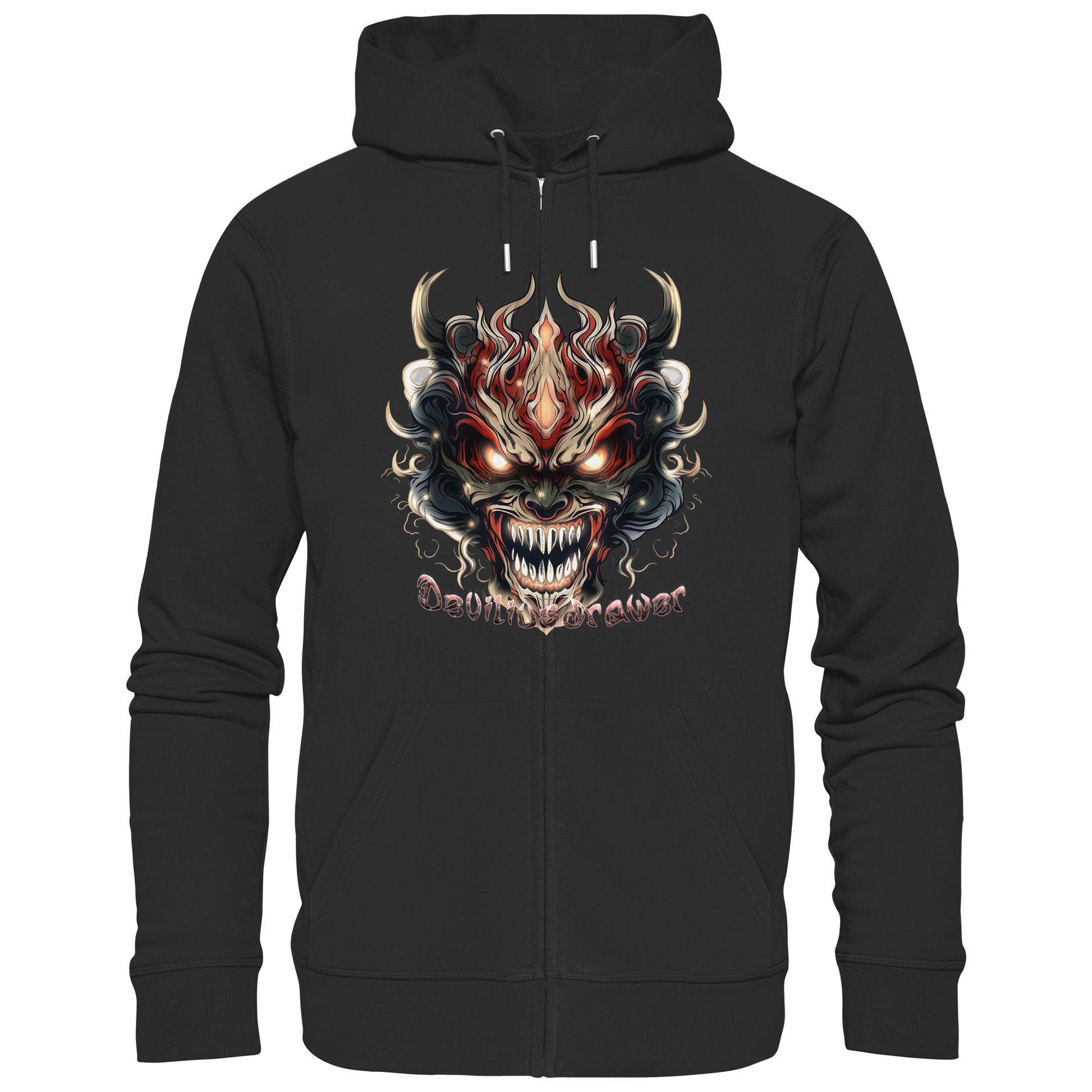 Design-Elemente: Die furchteinflößende Maske mit ihren feurigen Augen und scharfen Zähnen verkörpert rebellische Individualität. Die fließenden Linien und symmetrischen Muster schaffen eine hypnotische Balance.