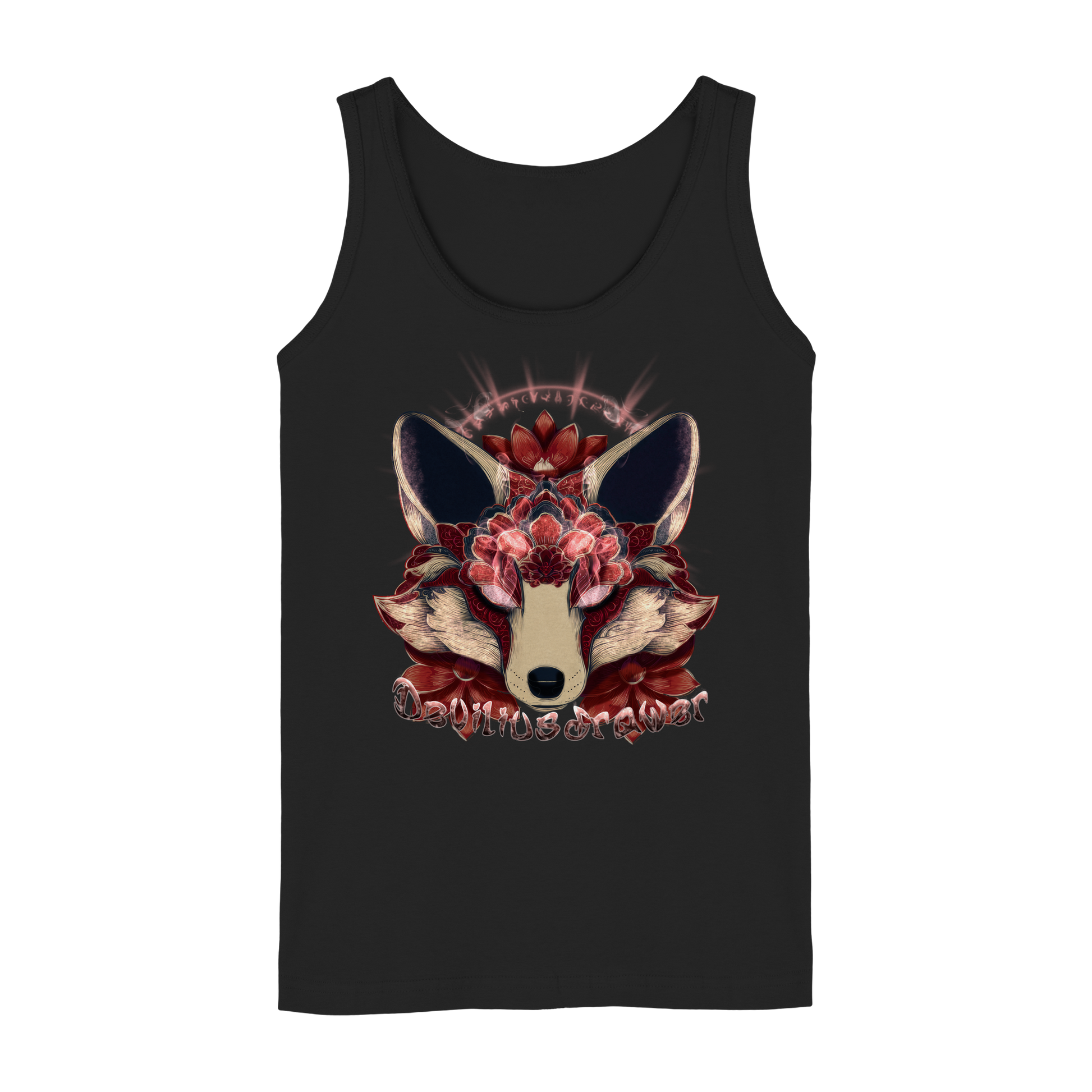 Das Deviliusdrawer Fire Kitsune Damen Tank-Top vereint kunstvolle Designs mit emotionalem Ausdruck. Der markante Kitsune-Kopf in leuchtendem Rot und Schwarz symbolisiert Kraft und Mysterium. Die floralen Muster umrahmen das Motiv und verleihen ihm eine geheimnisvolle Tiefe.