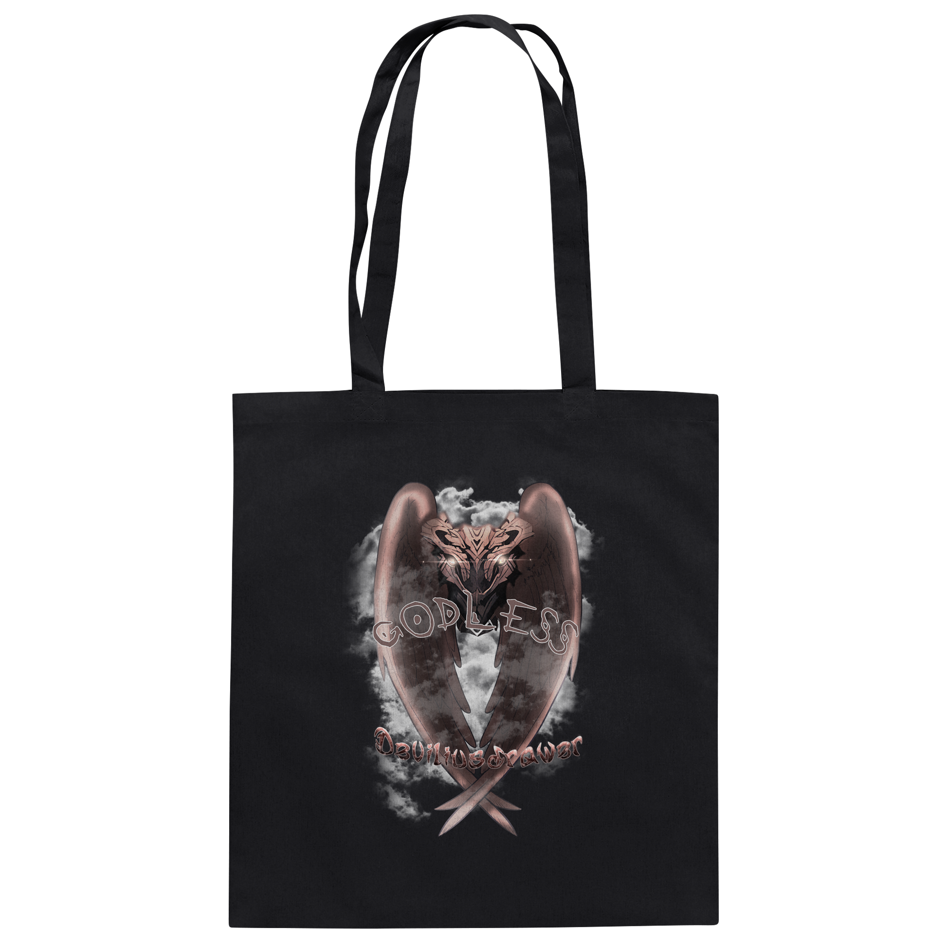 Typografie Die Schriftart ist kühn und dramatisch, was die kraftvolle Botschaft der „Godless“ Tasche unterstreicht.