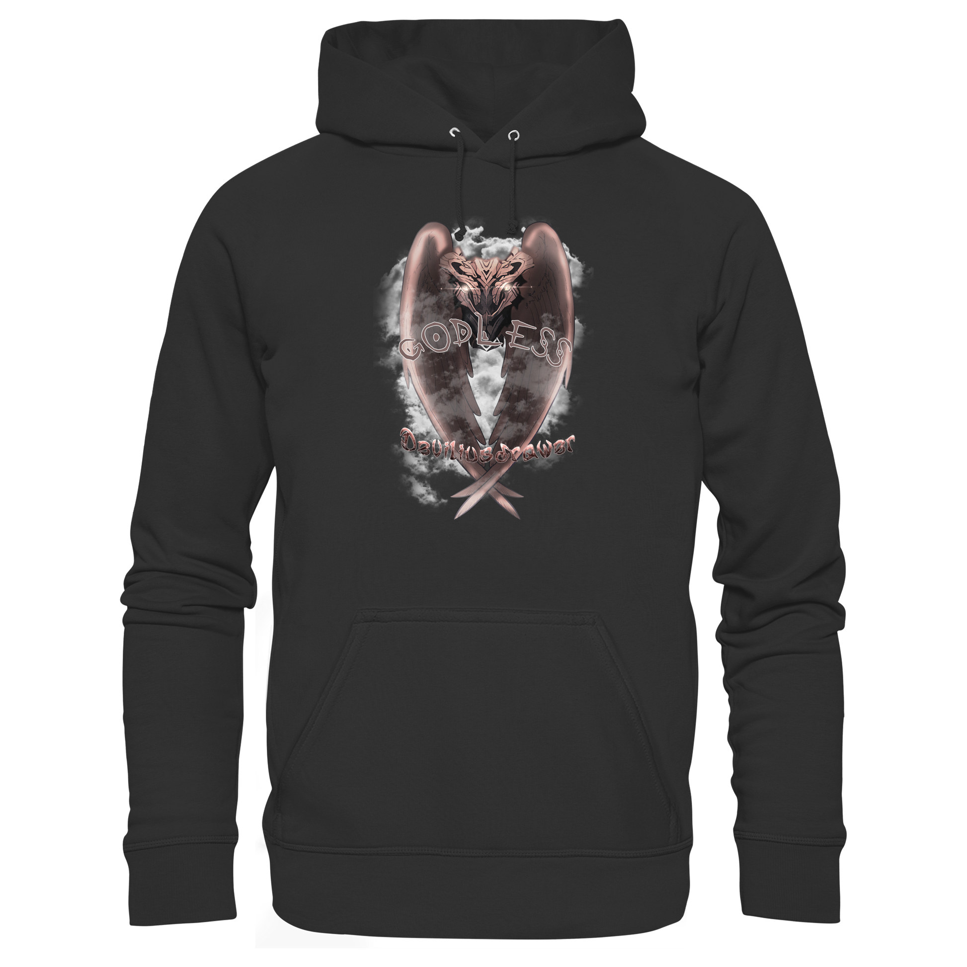 Die dominierenden Motive des mystischen Eulenflügels und die Schriftzüge "Godless" und "Deviliusdrawer" erzeugen eine kraftvolle visuelle Aussage.