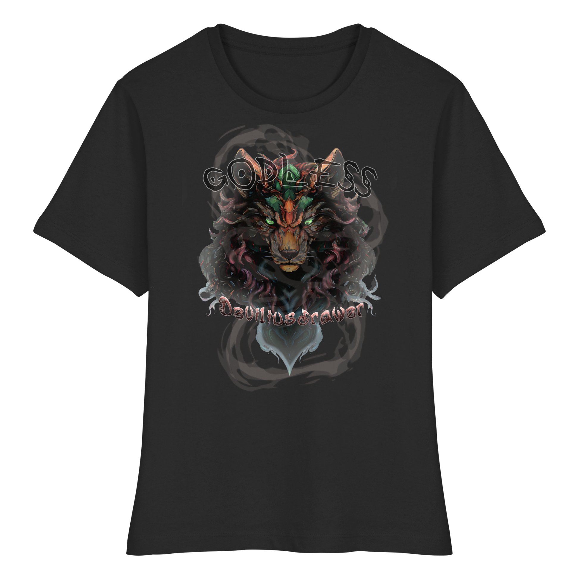 Das zentrale Motiv ist ein majestätischer Wolf mit komplexen Details, umgeben von mystischen Mustern. Der Text "Godless" und "Deviliusdrawer" verleiht dem Design eine rebellische Note.