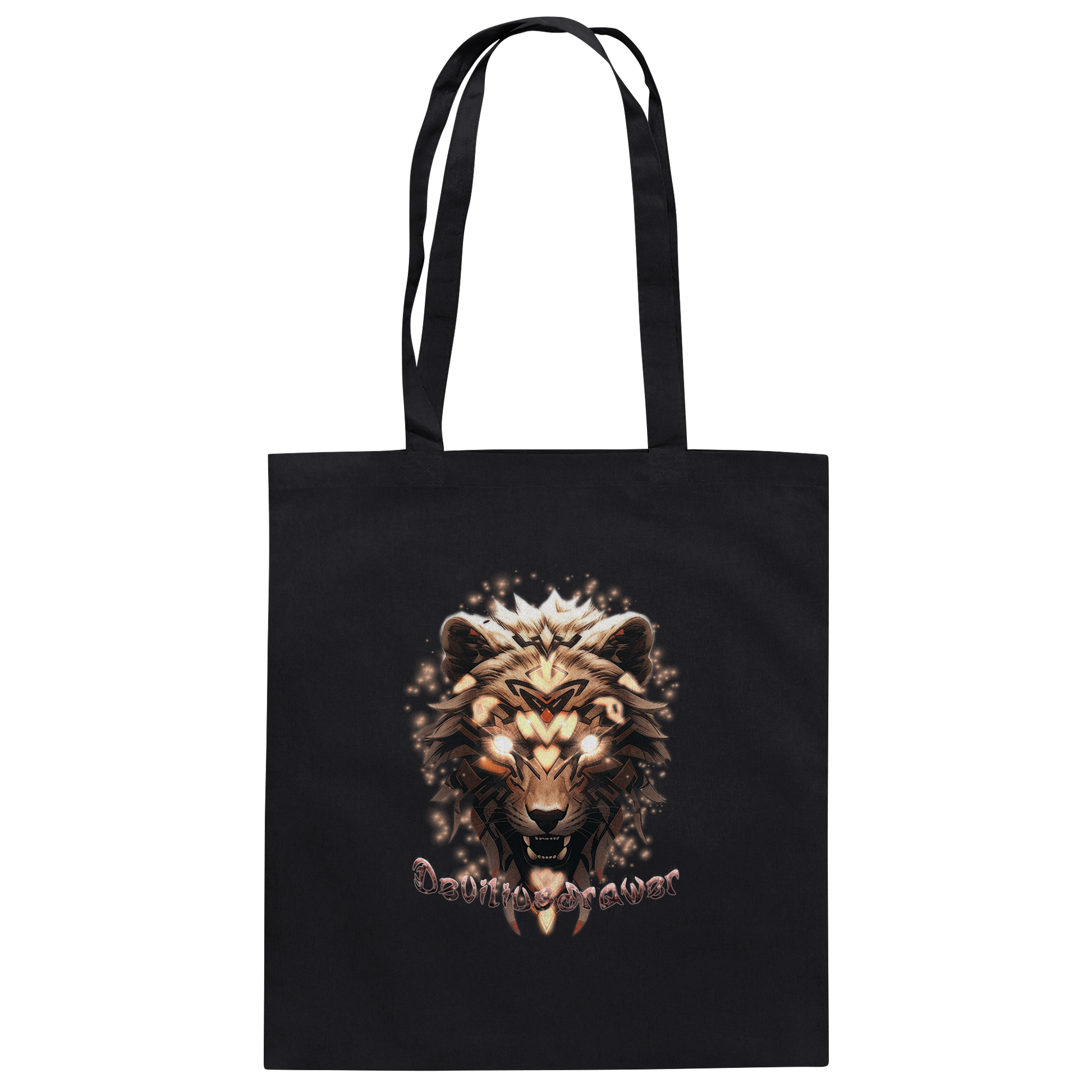 Die Tasche zeigt ein kraftvolles Tigerdesign mit leuchtenden Augen und geometrischen Mustern, die Mut und Entschlossenheit symbolisieren.