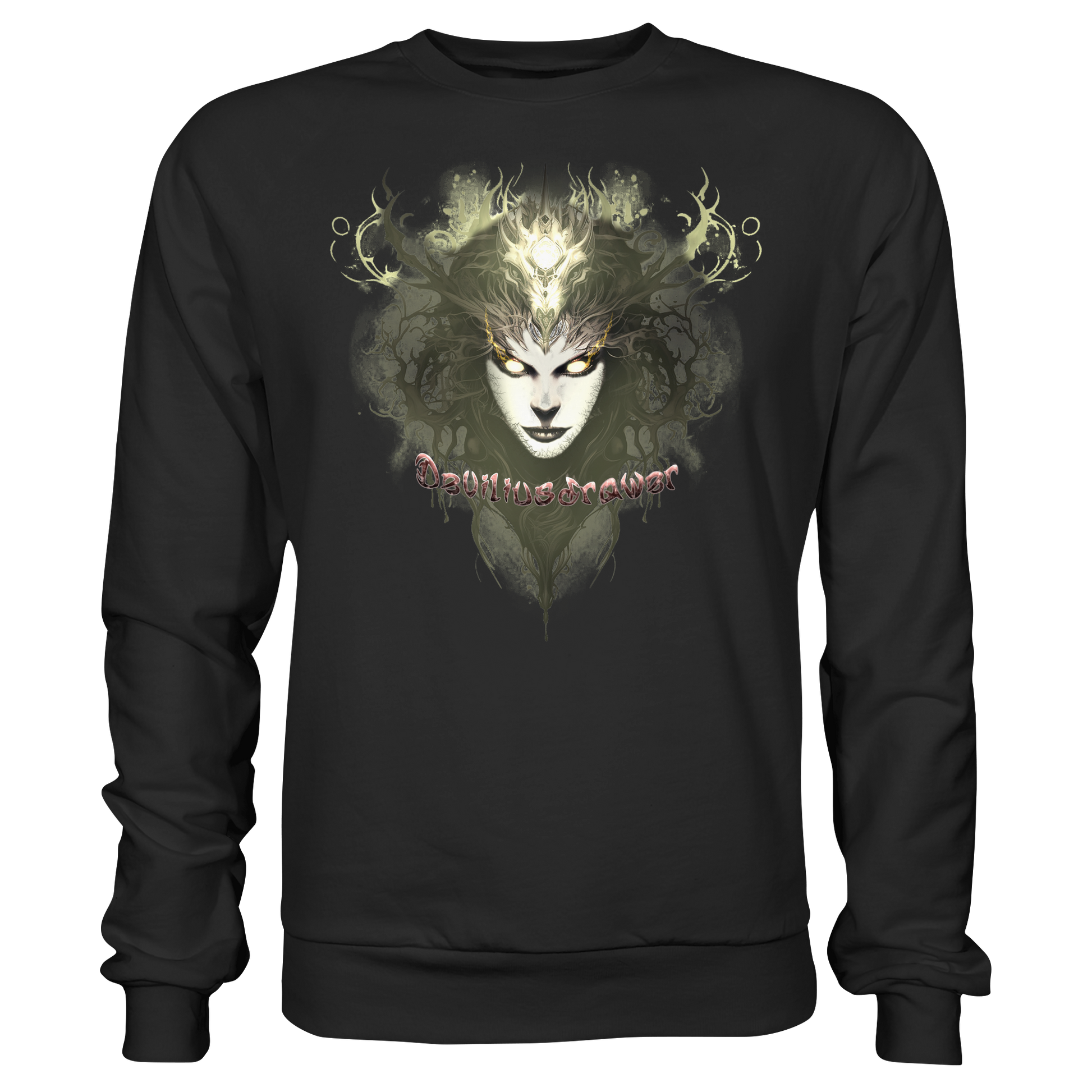 Die Deviliusdrawer Golden Demonica - Basic Sweatshirt fängt die Essenz mystischer Schönheit ein. Der zentrale Motiv zeigt ein geheimnisvolles Gesicht, umrahmt von filigranen, goldenen Ranken, die eine Aura des Unbekannten schaffen.