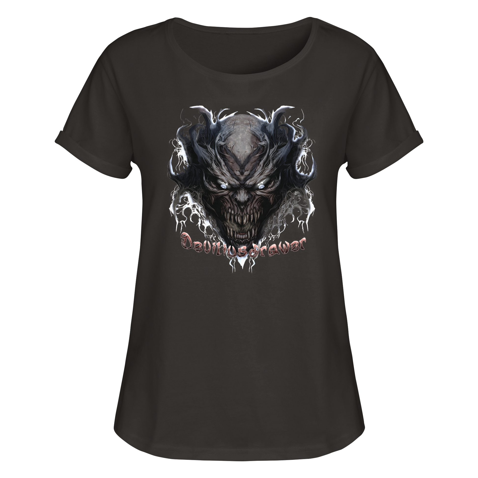 Der Schriftzug 'Deviliusdrawer' hebt sich in einer dramatisch verzerrten Schrift ab, die den rebellischen Geist der Trägerin widerspiegelt.