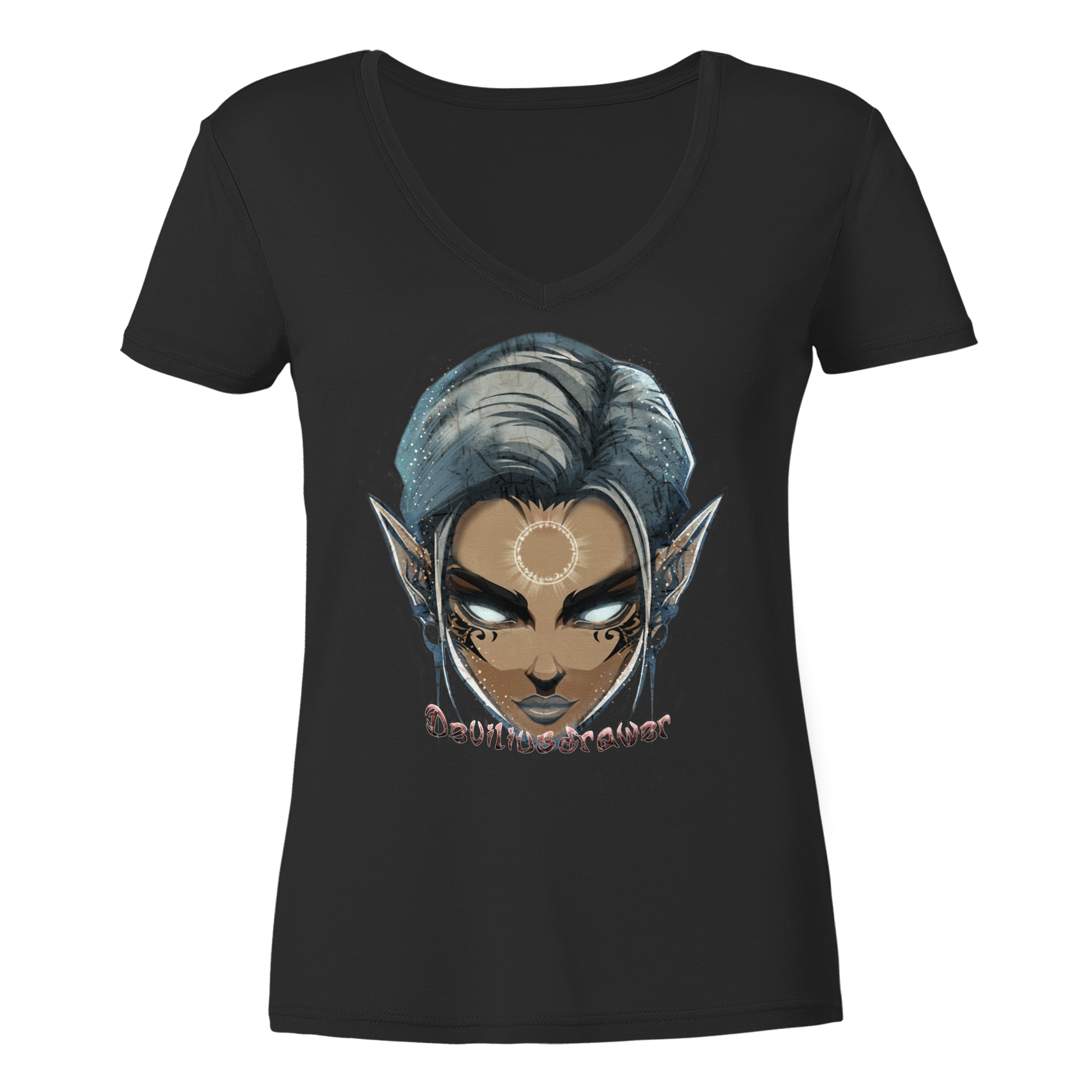Erleben Sie die mystische Welt der Magie mit unserem exklusiven "Deviliusdrawer Magician Elf - Ladies V-Neck Shirt". Der eindrucksvolle Elf mit intensiven Augen und filigranen Symbolen zieht die Blicke auf sich und erzählt eine Geschichte von Mysterien und Zauberei.