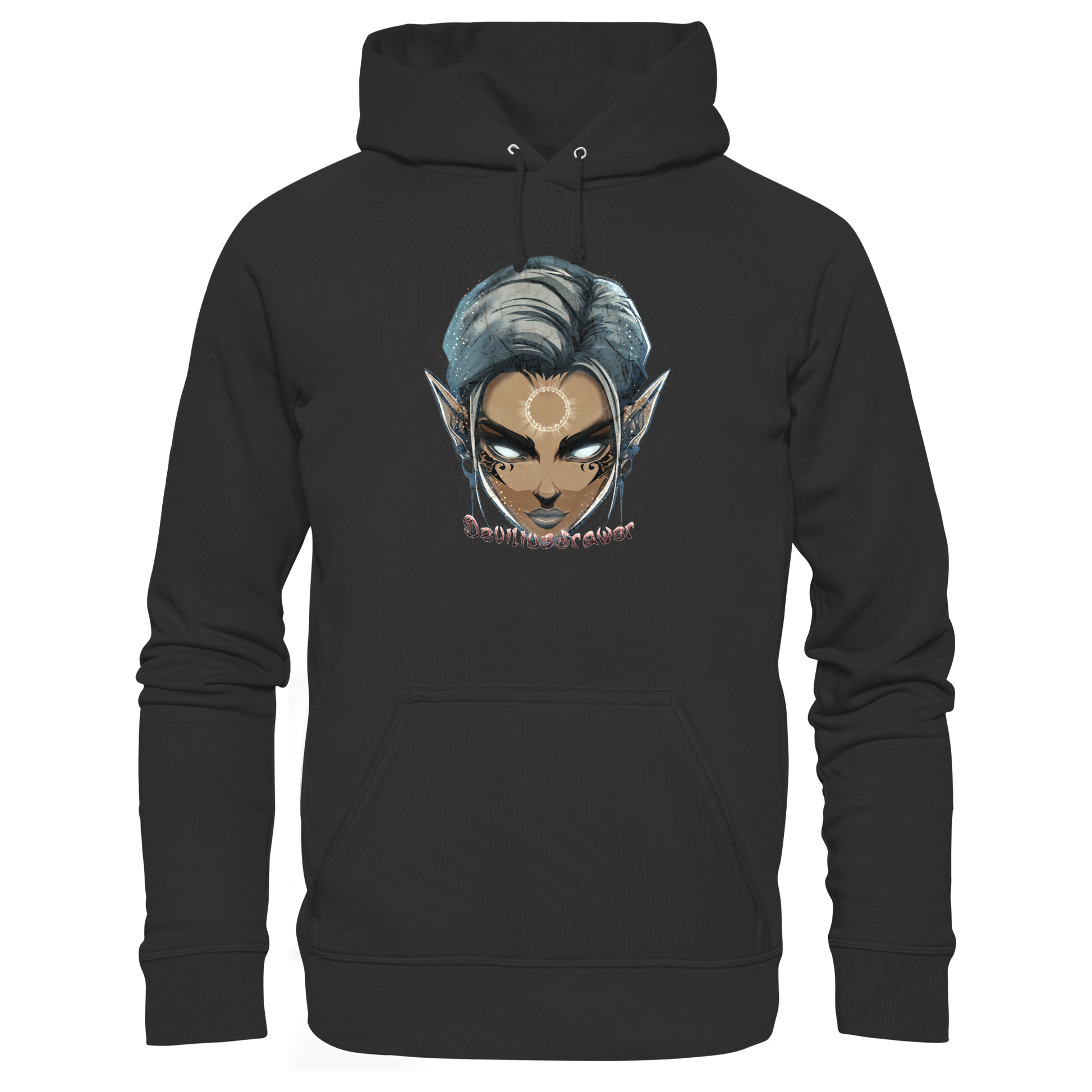 Der Hoodie besticht durch das eindrucksvolle Design eines geheimnisvollen Elfen mit leuchtenden Augen und kunstvollen Tribal-Motiven. Die harmonischen Blau- und Grautöne symbolisieren Ruhe und Gelassenheit und schaffen eine Atmosphäre von Magie und Abenteuer.