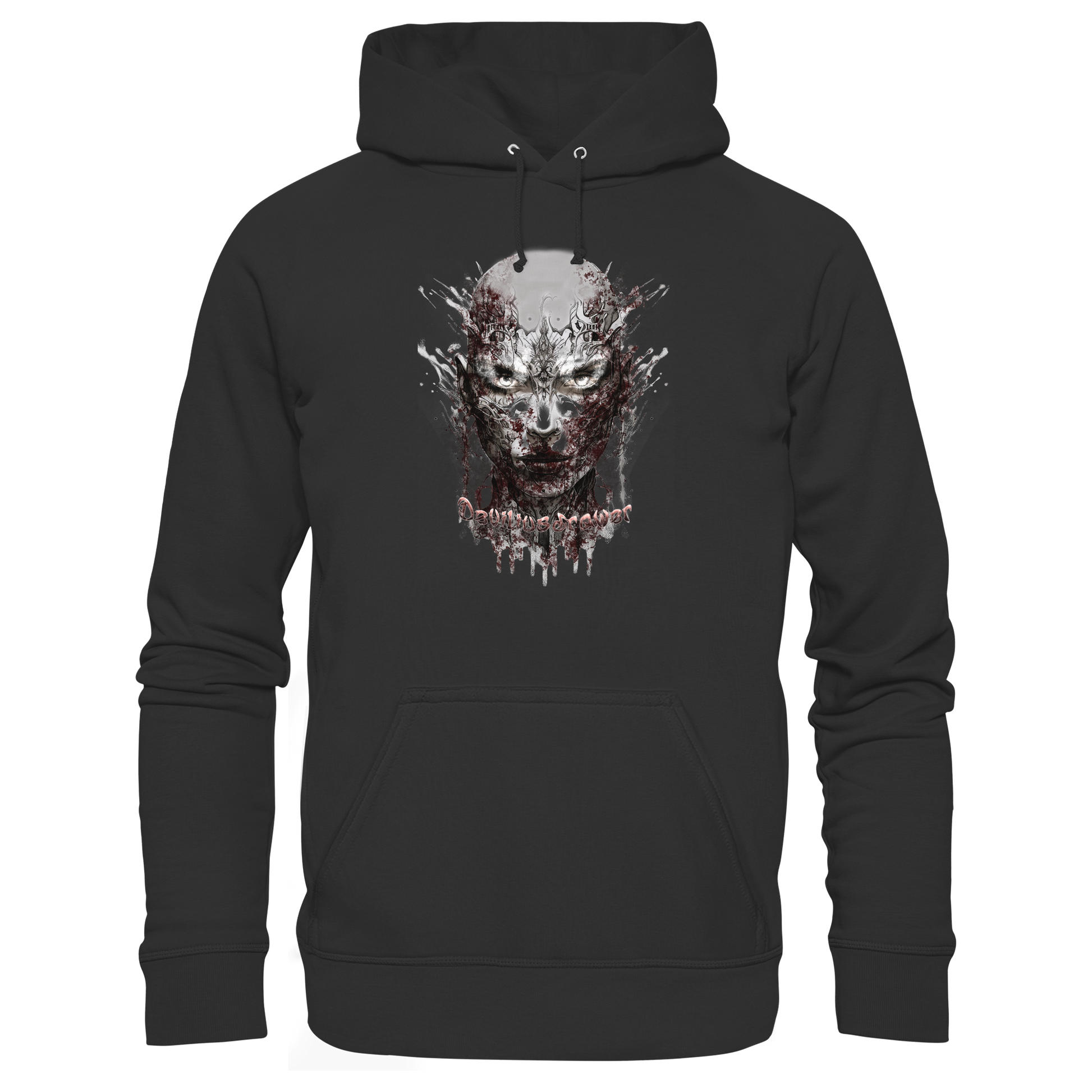 Der Hoodie zeigt ein faszinierendes Gesichtsmotiv, das durch kunstvolle Linien und rote Akzente besticht. Ein echter Blickfang, der Kreativität und Stärke symbolisiert.