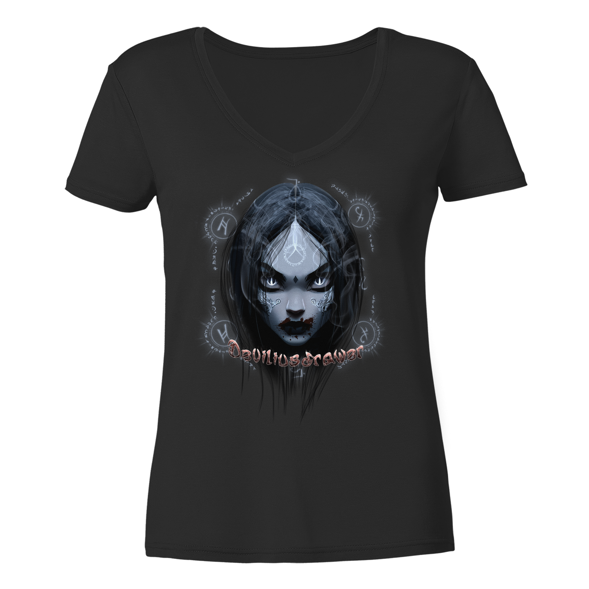 Entdecken Sie die mystische Welt mit unserem Deviliusdrawer Vampiric Elf - Ladies V-Neck Shirt. Diese limitierte Auflage verbindet kunstvolle Eleganz mit einem Hauch von Mystik.
