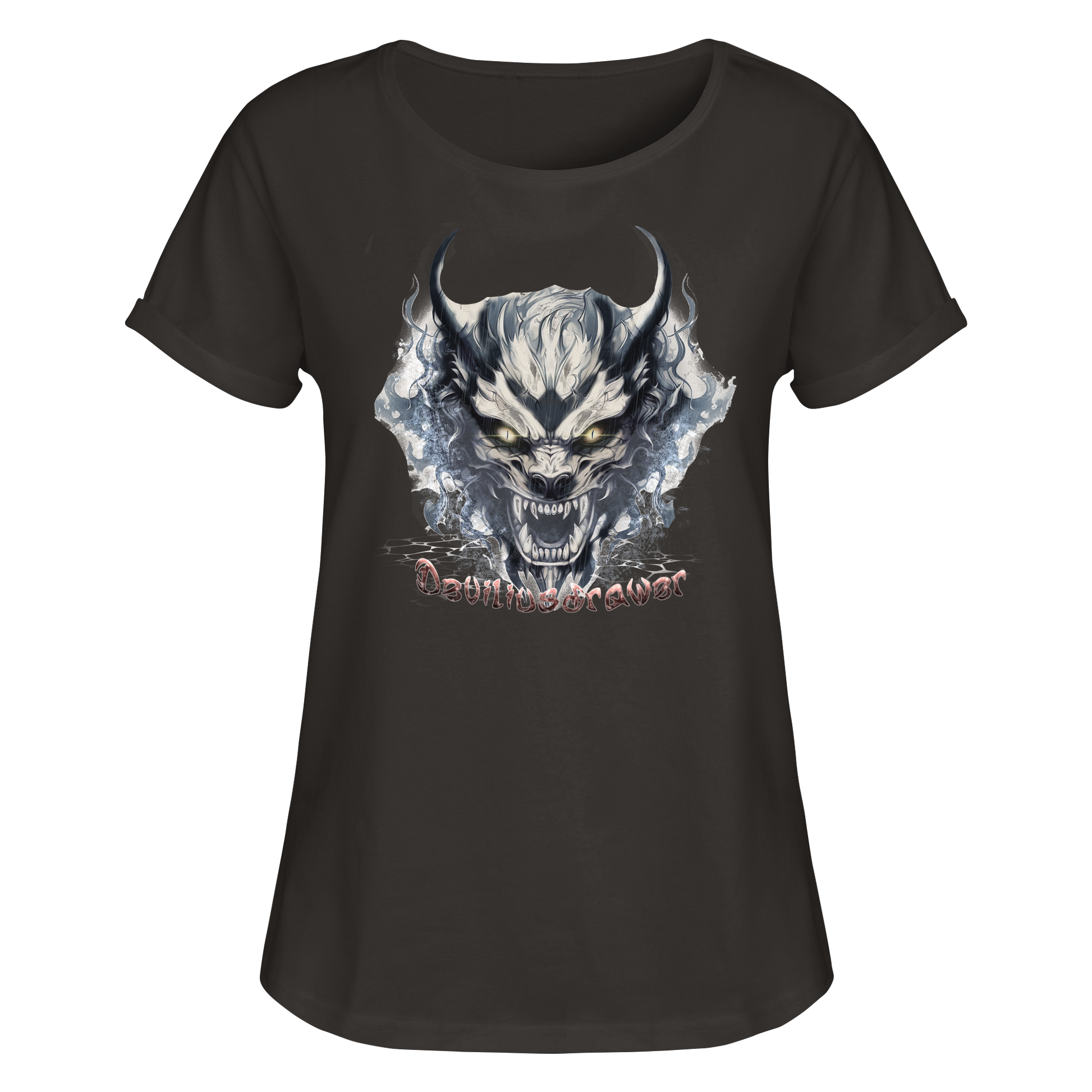 Die Deviliusdrawer Water Demon Damen Roll-Up T-Shirt vereint mystische Kunst mit einem Hauch von Eleganz. Das eindrucksvolle Dämonenmotiv in harmonischem Schwarz-Weiß zieht alle Blicke auf sich und symbolisiert Stärke und Unabhängigkeit.