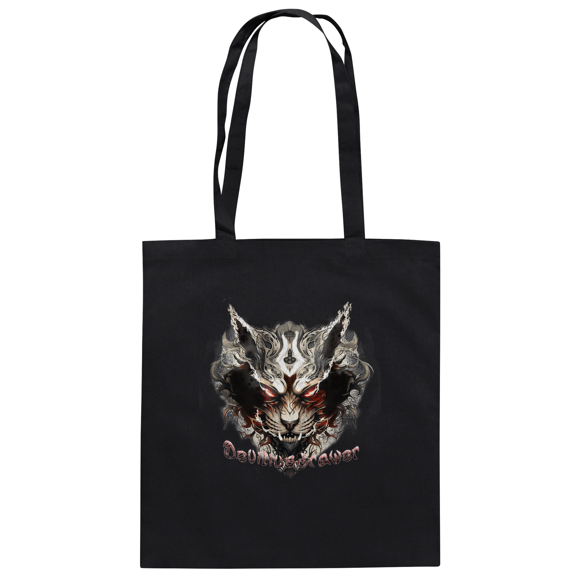 Erlebe die wilde Kraft der Deviliusdrawer Wild Hotcat Baumwolltasche. Das Design zeigt einen furchteinflößenden Katzenkopf mit feurigen Augen, umgeben von mystischen Rauchschwaden. Diese Tasche vereint Kunst und Funktionalität auf einzigartige Weise.