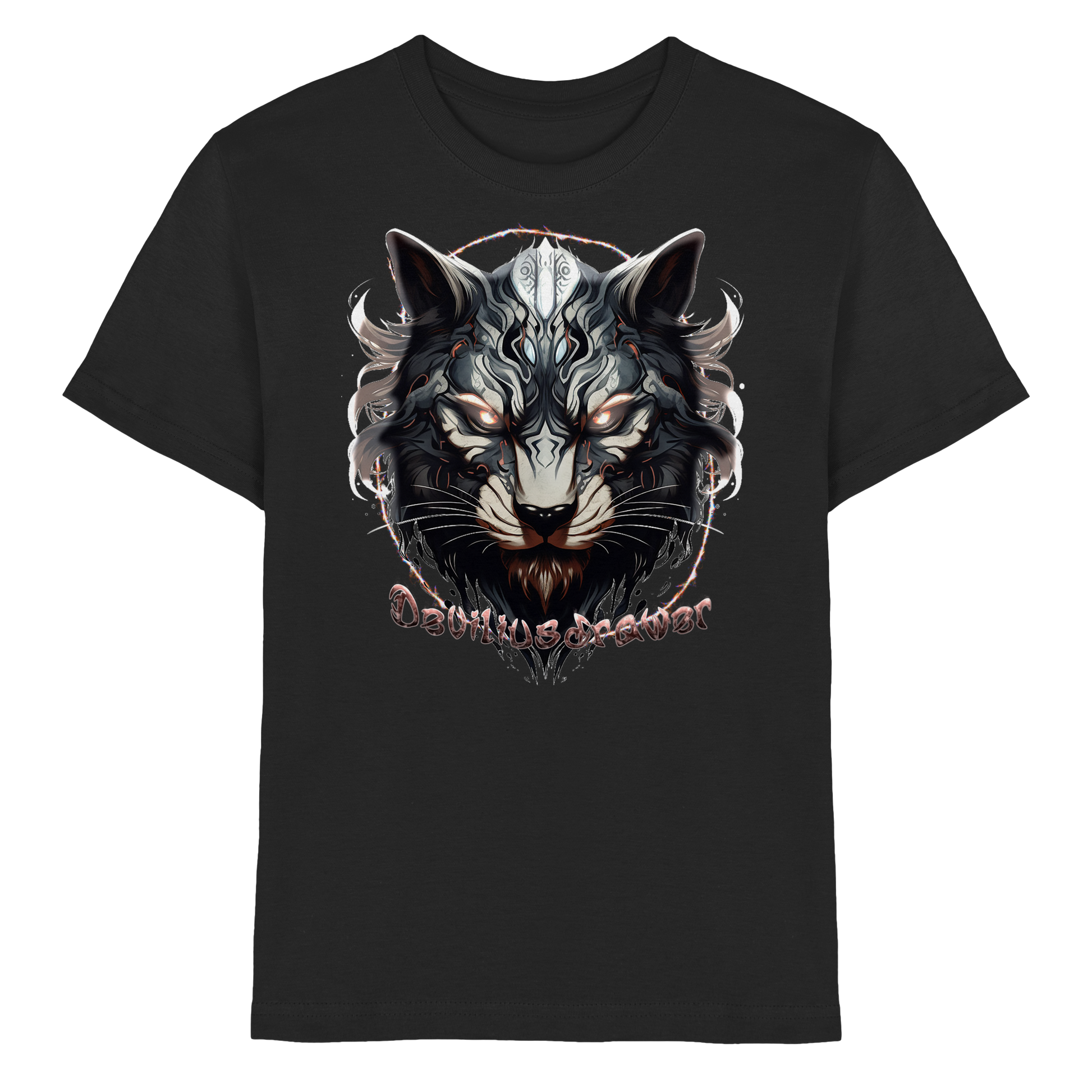 Entfessle die Fantasie: Das Deviliusdrawer Wolfcat Shirt vereint die mystische Anziehungskraft eines Wolfes mit der geheimnisvollen Eleganz einer Katze. Ein Design, das Kinderherzen höher schlagen lässt!